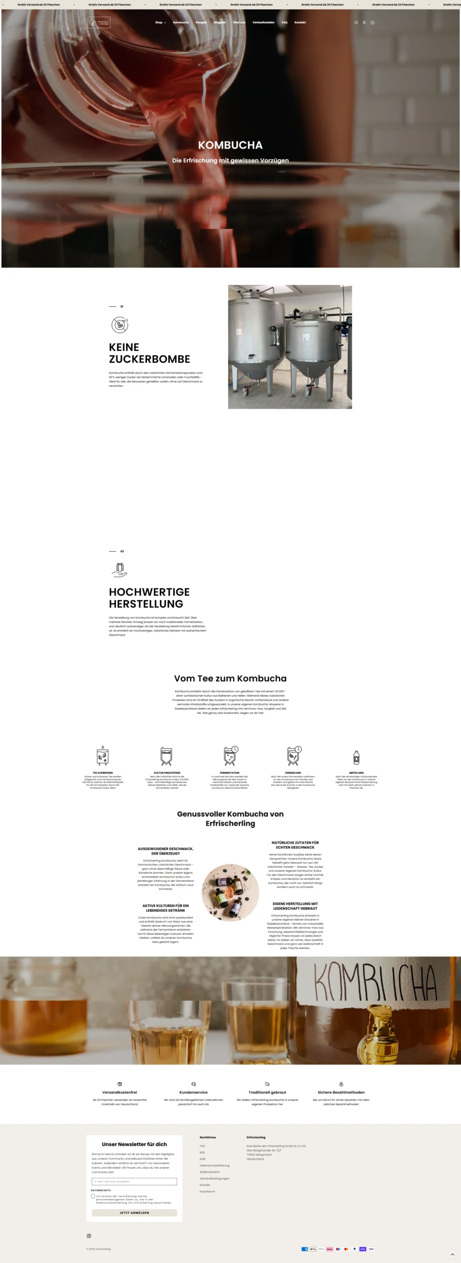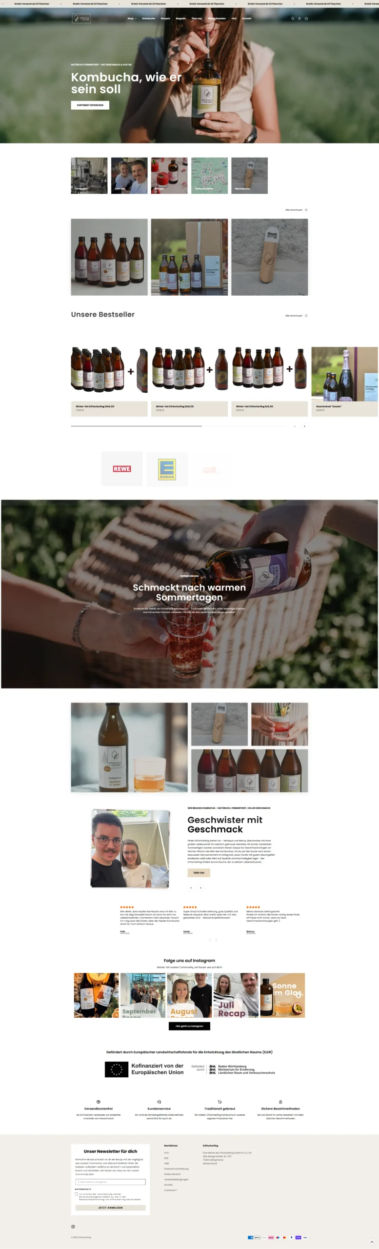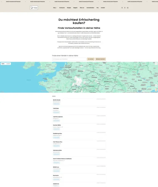 Wir betreuen den Erfrischerling Kombucha-Shop und haben den kompletten Relaunch von Wix zu Shopify umgesetzt. Neben dem neuen, modernen Design haben wir individuelle Funktionen entwickelt, darunter einen maßgeschneiderten Store-Locator, mit dem Kund:innen alle Verkaufsstellen des Erfrischerling Kombuchas schnell und intuitiv finden können