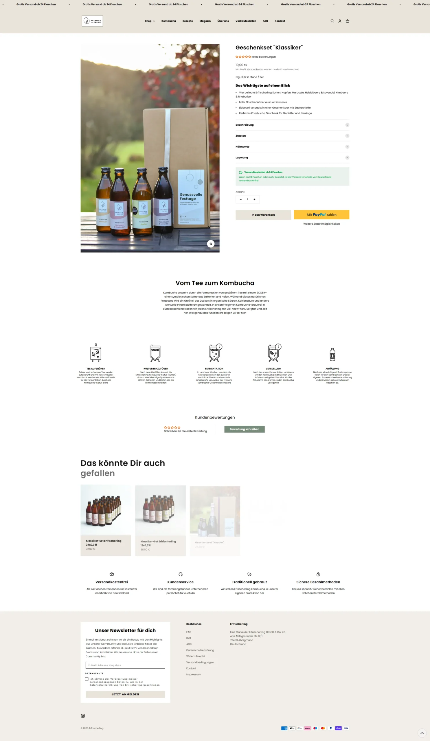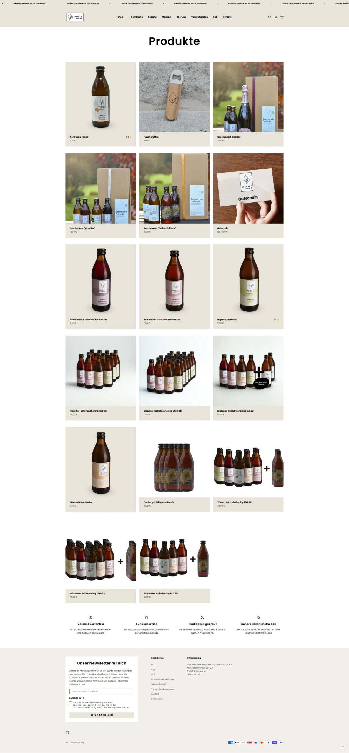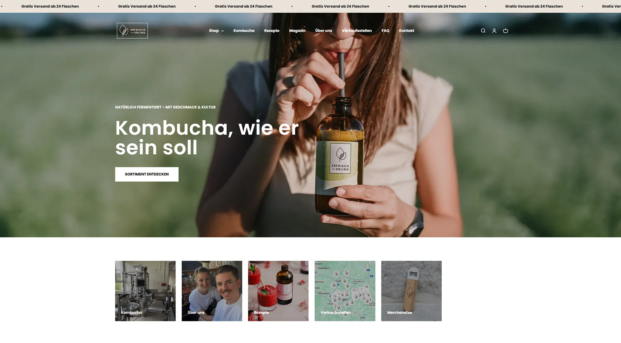 Wir betreuen den Erfrischerling Kombucha-Shop und haben den kompletten Relaunch von Wix zu Shopify umgesetzt. Neben dem neuen, modernen Design haben wir individuelle Funktionen entwickelt, darunter einen maßgeschneiderten Store-Locator, mit dem Kund:innen alle Verkaufsstellen des Erfrischerling Kombuchas schnell und intuitiv finden können